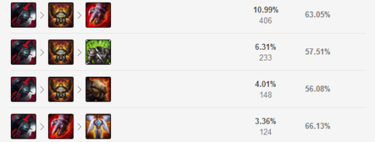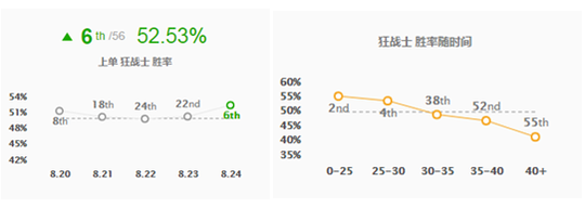 在8.24版本,奥拉夫的胜率到达了最近这几个月以来的巅峰,相较于8.23版本,奥拉夫的胜率提升了近百分之2。胜率提升了12名之多,这说明在8.24版本奥拉夫对于目前的强势英雄还是有些克制效果的。 而奥拉夫在30分钟前的胜率也是非常高IDE,几乎达到了百分之55,我们都知道目前强势的AP英雄都是约到后期越厉害,而奥拉夫在前期就能砍崩他们,他们自然也就没有了后期。25-30分钟是奥拉夫最强的时期,而在这个时间段AP英雄是普遍偏弱的。