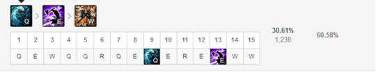 技能方面,推荐大家主Q副E,Q技能的减速和AOE效果不管是在奥拉夫追人还是清兵的情况下都非常重要,并且伤害也很高,因此要主加。E技能更加偏向于对拼时候的爆发伤害,因此副加。W技能作为一个BUFF技能前期点一点就够用了。