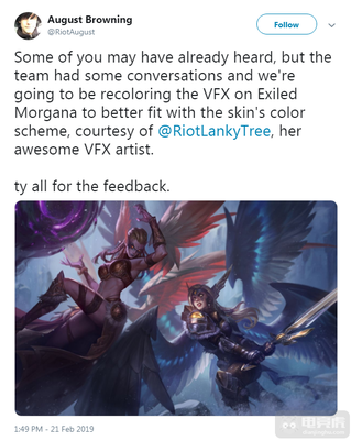 今日,拳头设计师August Browning在推特上发文称:经过团队交流后,对杀戮天使莫甘娜进行了重新着色。