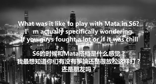 对于大多数人的印象中,UZI和Mata可以说是亦师亦友的关系,在和Mata搭档的那一年,UZI可以看到很明显的改变和进步,于是第二个问题就问到了他和Mata之间的关系:S6的时候和Mata搭档是什么感觉?我最想知道你们有没有争论还是很放松这样打?还是朋友吗? 对于这个问题,UZI还是提别提到了Mata的团队能力,能够带领一个团队的进步: S6和Mata搭档感觉他是在团队帮助方面作用特别强的一个人,他可以带领一个队伍去进步。 我们也算是朋友,因为平时聊天比较少吧,因为语言不通。