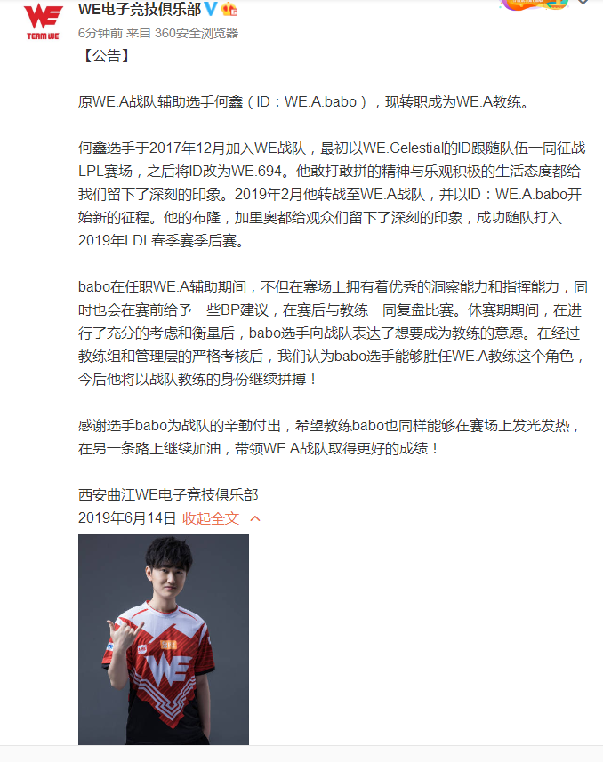 今日,WE官博发布公告:原WE.A战队辅助选手何鑫(ID:WE.A.babo),现转职成为WE.A教练。以下是公告原文: 原WE(we比赛视频).A战队辅助选手何鑫(ID:WE.A.babo),现转职成为WE.A教练。 何鑫选手于2017年12月加入WE战队(电竞明星战队),最初以WE.Celestial的ID跟随队伍一同征战LPL赛场,之后将ID改为WE.694。他敢打敢拼的精神与乐观积极的生活态度都给我们留下了深刻的印象。2019年2月他转战至WE.A战队,并以ID:WE.A.babo开始新的征程。他的布隆,加里奥都给观众们留下了深刻的印象,成功随队打入2019年LDL春季赛季后赛。 babo在任职WE.A辅助期间,不但在赛场上拥有着优秀的洞察能力和指挥能力,同时也会在赛前给予一些BP建议,在赛后与教练一同复盘比赛。休赛期期间,在进行了充分的考虑和衡量后,babo选手向战队表达了想要成为教练的意愿。在经过教练组和管理层的严格考核后,我们认为babo选手能够胜任WE.A教练这个角色,今后他将以战队教练的身份继续拼搏! 感谢选手babo为战队的辛勤付出,希望教练babo也同样能够在赛场上发光发热,在另一条路上继续加油,带领WE.A战队取得更好的成绩! 西安曲江WE电子竞技俱乐部 2019年6月14日 |