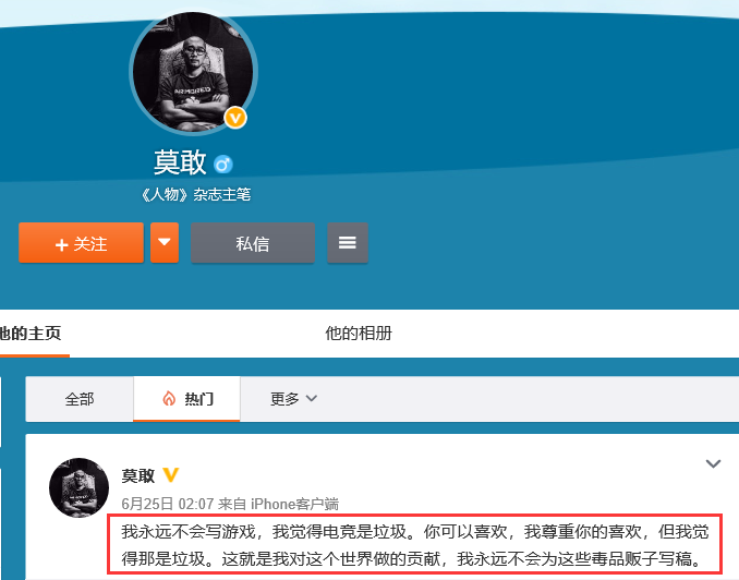 就在6月26日上午9点,一向在微博上以聊天打趣为主进行更新的“星际老男孩”黄旭东却出人意料地手撕了一位“电竞圈外人”,并且还在半小时之内连发三条微博,直接与一位微博ID名为“莫敢”的《人生》杂志主笔硬刚了起来! 黄旭东连发三条微博 并且发出了两发发自肺腑的祝福:“希望你和你们杂志越办越好,加油,兄dei”“你好好写你的作品去吧”这简直就是将奶瓶硬灌给人家喂毒奶,就是不知道这位老哥的身体素质是否过硬,家里是否常备着宝矿力,这次会不会直接遭了重呢? 那么这位老哥究竟做了什么“丧天害理”的恶事,竟会引起黄旭东如此巨大的反应呢?原来人家可不是针对黄旭东一个人,而是在自家微博上公然挑衅,游戏电竞圈在座的各位都是垃圾。 这位人物杂志的主笔在6月25日发表了一条挑衅全电竞圈的微博:“我永远不会写游戏,我觉得电竞(电子竞技频道)是垃圾。你可以喜欢,我尊重你的喜欢,但我觉得那是垃圾。这就是我对这个世界做的贡献,我永远不会为这些毒品贩子写稿。” 微博掀起战争! 并且在评论区之中,直接与各大网友们进行了一波硬刚,公然表示:“电竞是毒品。是狗屎。电竞明星是毫无价值的时代幸运儿。这么说是不是清晰了。”一副杨教授死忠粉的模样,如此硬核的言论,也把闻讯而来的网友们给逗笑了“都9012年了还网瘾网瘾的,村里刚通网系列 ” 大骂电竞是狗屎 只不过在广大吃瓜网友的深挖之下,这位敢于挑衅游戏电竞圈的高尚人士,却没有像杨教授那样呼风唤雨的雷霆之力,起码对于自己心中“电竞垃圾”的信念,可是并不是像嘴上说得那样坚定不移呢! 回顾他17年3月25日发表的微博来看,明显这位愤世嫉俗的“带文豪”,在两年前还颇具情调地用RPG游戏《英雄无敌》来表达自己在事业方面不断“开疆拓土”的壮举呢! 两年前还用“英雄无敌”来比喻事业 更可怕是在2015年的微博中,这位视游戏如毒品的主笔编辑,更是在9月5日跟同事吸了一个通宵!而且在9月30日还洋洋自得地表示,自己打游戏打得手指快废了,明明就是一位活灵活现的网瘾大叔形象啊! 而除了这些还不够,在他2014年有关“小米盒子”的微博中,你还会发现这位网瘾大叔还得对于二次元动漫也十分热爱,能够荒废一晚上的时间去挑动漫看,天知道哪天他又会发表一则“视动漫如垃圾”的惊天言论吧?不知道各位喜爱二次元的小伙伴,你们慌了吗? 自曝热爱二次元动漫 总结来看,这位二次元网瘾大叔真的是闲得慌,明明自己对于游戏那么喜爱,却还得在网上戴上面具大骂电竞是狗屎,这样活着也蛮辛苦的!游戏玩家又何苦为难游戏玩家呢? |