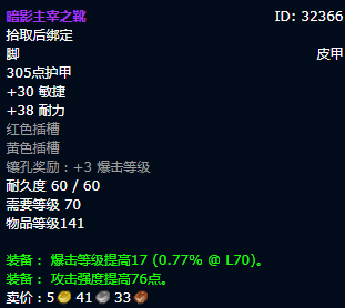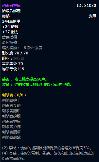 魔兽世界TBC P3开始后,盗贼终于可以获得自己的橙武,战斗力提升的简直不是一点半点。由于盗贼T6可以提升切割效果,这就意味着盗贼拿到自己最强武器之后,可以砍出更高的白字伤害。如果玩家同时还装备龙脊的话,输出提升又会是一个巨大的提升。 盗贼玩家想要打出足够高的伤害,自然也离不开装备的支持,由于盗贼还是以平砍为主,所以命中和暴击必须达标。此外,护甲穿透装备也可以加成盗贼的输出,属于盗窃玩家必备装备,基于这几点,今天给大家介绍下盗贼的P3 BIS装备。 头部装备首选萨格拉斯的诅咒视界。这件装备属性要比T6要强,同时也不妨碍玩家凑出T6四件套属性,所以玩家选择这件装备即可。 肩部装备首选刺杀者护肩,2件套使你的切割技能所提供的急速效果提高5%。4套装使你的背刺、影袭、毁伤和出血技能所造成的伤害提高6%。这对于盗贼的输出提升相当明显。同时还具有无视护甲的属性,非常值得盗贼玩家拥有。 披风装备首选影月毁灭者斗篷,命中、暴击双增幅,还具有非常不错的攻强加成。 胸部装备首选刺杀者胸甲,理由同肩部,不过多解释了。 手腕装备首选阴险护腕,除了命中以外,还有一个黄色插槽,方便玩家配装。 手部装备首选刺杀者护手,理由同肩部,不过多解释了。 腰部装备首选百亡腰带,25点精准对于盗贼的提升简直不要太明显,相信绝大部分的玩家在P2都已经入手了。 腿部装备首选刺杀者护腿,理由同肩部,不过多解释了。 脚装备首选暗影主宰之靴,虽然属性不是特别强,但是还有两个插孔,可以进一步提升玩家的输出。 项链首选无尽梦魇项圈,命中、暴击双增幅,黑庙老三掉落。 戒指首选怒风徽记之戒、游侠将军指环。游侠将军指环就不必多说了,毕竟装备属性在那里摆着,怒风徽记之戒则是少有的可以提升破甲的装备,玩家一定不要错过。 饰品首选龙脊奖章、星界螺旋。这两件装备也没有什么好解释的,也就后期星界螺旋换薄片。 武器选择埃辛诺斯战刃,根据体验服的测试情况,这把武器的掉率在14%左右,所以入手的难度并不是特别高,玩家只要准备好足够的金币就可以了。 盗贼在P3版本只要拿到埃辛诺斯战刃和T6,就可以打出非常高的输出,所以玩家优先一定要搞到埃辛诺斯战刃和T6。不过有一说一,单刀的盗贼到时候肯定不少,这里建议团队在开boss尸体之前,一定要多洗洗脸。 |