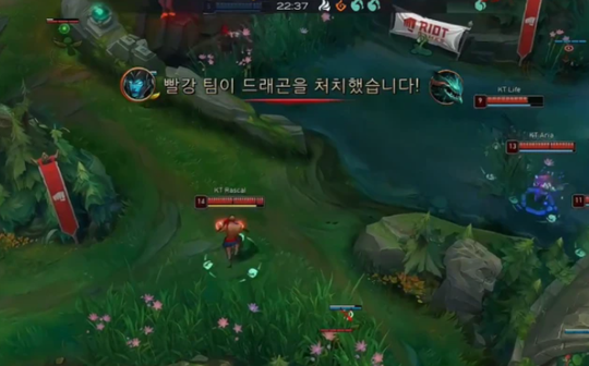 进入召唤师峡谷,不出所料,KT再一次在前中期取得优势,Rascal盲僧连续单杀GEN上单Doran蛮王,另一边KT打野Cuzz控住前三条小龙,组成GEN中野的Chovy、小花生Peanut陷入被动。 第四条小龙刷新后,GEN与KT爆发正面团战,Cuzz波比依靠大招“锤飞”GEN小花生Peanut,将水龙魂稳稳收入囊中。