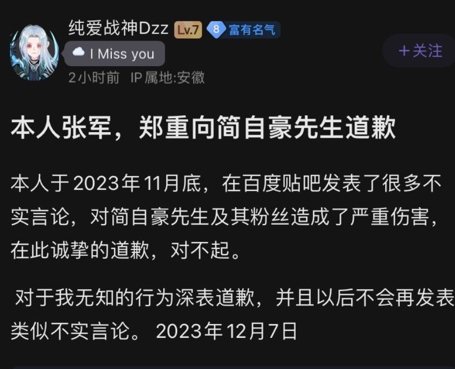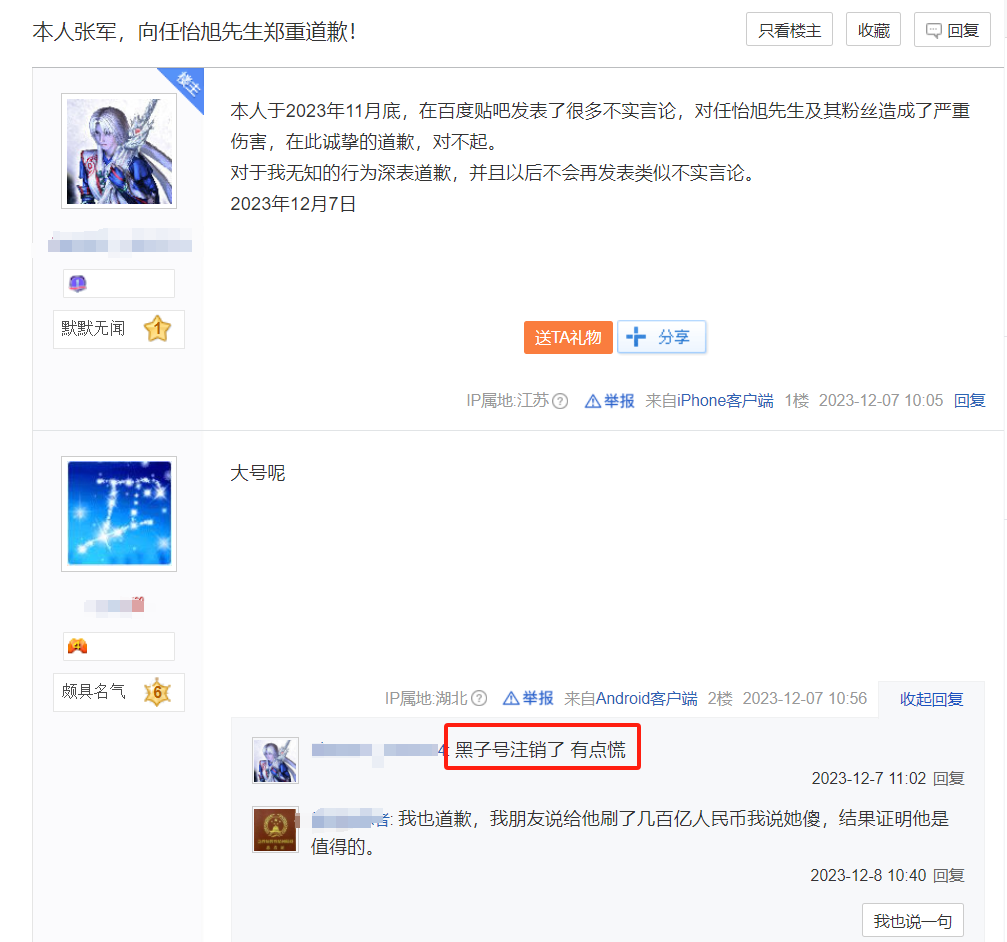 互联网并非法外之地,大家在上网冲浪发表言论之际,也得谨言慎行,要不然真有可能要跟别人对簿公堂。近日,一则来自抗压吧老哥的公开道歉信引起了网友关注,这封道歉信究竟是怎么回事? 据了解,这位叫张军的网友于11月份在抗压背锅吧发表了大量“嘲笑Uzi红温、封印邪神”的贴子,里面内容影响到Uzi本人形象,其女友奥咪咪保留了追究的权利。没过多久,Uzi女友更新了个人动态,并且列举了小黑子的名单:在抖音平台黑Uzi的有4个人,基本是00后小孩子;微博平台的资深黑粉有3个人;至于贴吧的小黑子大部分都是90后,有一个人她是必告的。 所以,结合前因后果来看,这位叫张军的网友极有可能就是奥咪咪必告的那个人,大概率是收到了律师函警告,所以在贴吧公开跟Uzi道歉,想要征求对方的谅解。 对此,抗压背锅吧网友都各抒己见:“你发的全是真实言论”,“不是邪神?关简自豪什么事”,“还是那句话网络并非法外之地”……顺带一提,这个道歉信在旭旭宝宝贴吧也出现了,同样也是这位叫张军的网友所发,他表示自己已经注销了大号,害怕被旭旭宝宝寄律师函。 目前这事的真实性还有待考证,但从几个主播寄律师函的速度来看,确实是有不少黑粉收到了律师函。小伙伴们对此有什么看法呢?欢迎在下方留言分享。 |