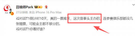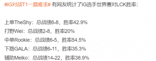 距离本次世界赛最特殊的入围赛,IG对战T1争夺16强的开启已不足10天,很多想进现场看这场比赛的网友纷纷发动人脉关系,想要收到一张票。但让人没想到的是,包括专业解说、俱乐部经理都纷纷表示,这场比赛尚无余票,就连赠票也无法搞到。同时,有网友发现IG俱乐部仍处于放假状态,选手尚未开始训练。 首先,根据博主“召唤师Park”的透露,因为这次世界赛是由拳头主办的关系,LPL联盟与国内俱乐部手里也没有赠票存量,想去现场观赛有且仅有“抢票”一个渠道,所以目前连俱乐部金主都不一定有这个门票。 其次,在此前的某些二手网站上,有关这场的门票已经被炒到8000块了,且光速被抢购一空。而随着大家对比赛的关注度上升,目前就连二手市场也没门票卖了,如果你真想淘一票的话,估计价格会靠近一万块。 最后,就是解说方面,毛毛近日也发文表示,连他自己的票都没抢到,更不用说有其他渠道可以去现场看比赛了。 但与大家疯狂抢票,想要去线下为IG加油助威形成鲜明反差的是,有网友发现除了AL之外,IG、TES、BLG三支战队仍在放假中,无一名选手上号打排位找手感。这引起了不少人的担忧,尤其是IG粉丝觉得IG在季后赛的发挥本身就差,选手还不能多训练找回状态,有可能会被T1三比零速通。 更加搞事的是,有热心网友统计了IG各成员在世界赛对LCK战队的胜率,结果意外发现仅Rookie一人胜率超过了50%,其他成员的胜率均不足50%,Wei的胜率更是只有可怜的20%,属实也是有点惨了。 相反的是Faker打LPL战队BO3的胜率高达64.66%,BO5的胜率高达70%,也是让人心生绝望。所以,大家觉得按照目前的情况来看,这个入围赛IG与T1到底谁能进入16强呢? |