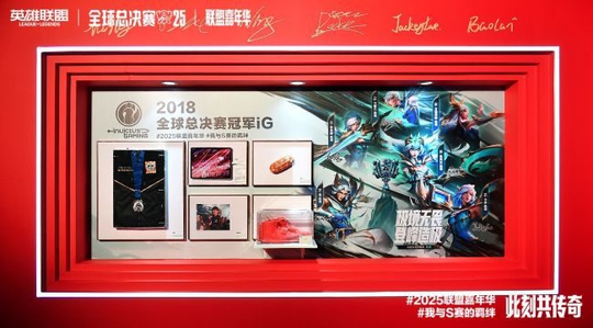 同时,现场还设置了展览区,该展览是官方联合发起的 “助威纪念物件” 征集活动成果 —— 前期不仅定向邀约Baolan、LWX、Jiejie 等传奇选手贡献私藏纪念物,更面向全网召唤师征集与 S 赛相关的情感载体,最终从海量投稿中精选出 100 份展品。现场,Baolan的冠军奖牌、 Tian 的 FMVP 奖杯、Flandre 的彩带球,还有玩家的 iG 项链、EDG 应援手幅、SN 赛事纪念币等物件整齐陈列。让观赛仪式不止于 “看比赛”,更成为召唤师们共享电竞记忆、凝聚应援力量的情感阵地。 下午三点左右,“传奇登场·荣光启幕” 开幕仪式开启。伴随 LPL 赛区主题曲,主持人正式开场,之后 Baolan、LWX、Jiejie 隆重登场,分享 S 赛记忆并为出征战队送祝福。仪式高潮,全场灯光渐暗,特制 “金沙漏” 开始流转,细沙填满容器的瞬间,漫天金色彩带如 “金色雨” 洒落,大屏同步播放 LPL 出征战队视频,现场召唤师举起应援助威棒,用呐喊与灯光汇成金色海洋,氛围推向顶点。