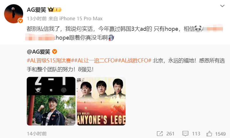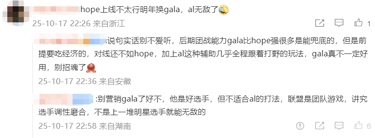 10月17日晚,在S赛瑞士轮2-0阶段,AL战队让一追二击败CFO,成为LPL首支进入八强赛的队伍。这本是一个让人骄傲的成绩,可出人意料的是,因为AL经理下场跟网友对线的关系,反倒把自家选手Hope又一次推上了风口浪尖。 由于CFO战队AD选手Doggo的出色发挥,导致很多看比赛的观众对AL战队的Hope实力提出了质疑。不少人都觉得Hope从第一赛段开始,就没站出来过一次,发挥一直都比较平庸,是否需要考虑补强或者特训? 对此,AL战队经理爱笑直接闪现开团,对线这些观众:“都别私信我了,我说句实话,今年赢过韩国3大ad的 只有Hope,相信AL”。 在评论区,爱笑更是直接对着那些觉得Hope实力不行的粉丝直接开火:“天天这个强那个强的,我不知道那个强?”,“杠精别杠了,简单俩点:1.我不惯着任何人黑我的兄弟 2.笑从不骂人,你有评论和骂我的权利,我有拉黑你的权利 ”…… 说实话,经理站出来维护选手这个事情本身是没有问题的。可在客观层面,Hope在对战CFO比赛中也是被对面Doggo压制了三局,全场评分仅有5.7。所以,网友觉得AL战队的短板出在AD身上,也不算什么大问题。 只能说,大家都是为了LPL能出成绩而出谋划策,不至于闹到网络对线的程度。 不过,某些极端粉丝,动不动就让AL经理明年换XX选手上,AL就无敌了的言论,也确实容易让人看得血压升高。毕竟组战队这个东西,又不是简单的加减乘除,选手之间都需要磨合,Hope的个人能力虽然不突出,但他能在团队需要的关键时刻发力,给团队打出应有的输出,这就已经很难得了。 就目前来看,AL这支战队依旧是围绕中野打节奏,前期通过辅助游走来保证能够速龙拿资源。所以,Hope的战术地位更多在单人打钱不劣,不会被线杀,稳住发育这上面。而说实话,对比起ELK、哥哥,Hope的场均死亡次数是最低的,相当稳健。 |