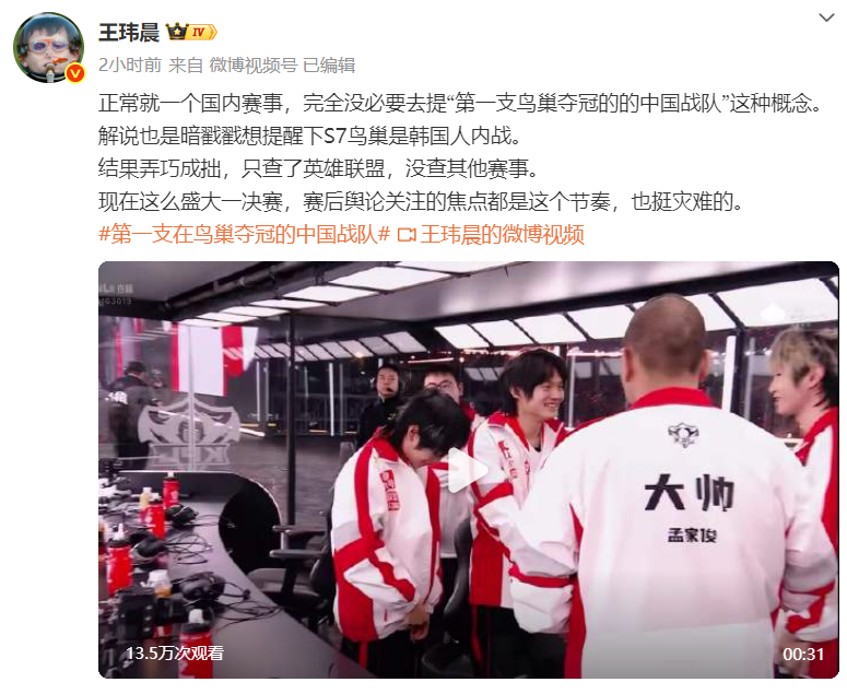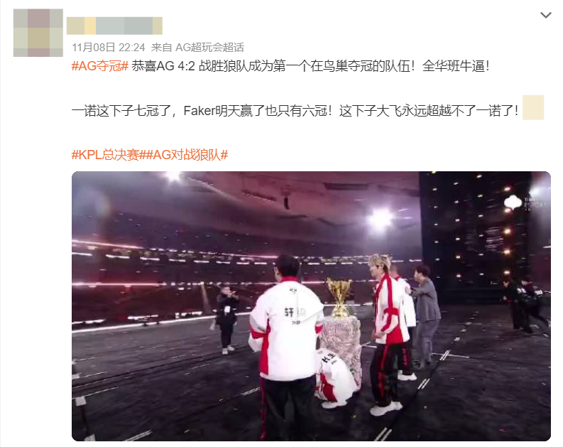 11月8日晚,随着《王者荣耀》KPL年度总决赛的落幕,AG超玩会4比2击败重庆狼队,拿下队史第8座冠军奖杯,并创造KPL六连冠纪录。 这原本是一个荣耀加冕的时刻,但却因为解说的一句话“创造历史!AG超玩会成为第一支鸟巢夺冠的中国电竞战队”,在游戏圈掀起了轩然大波。 因为经网友查证,“第一支鸟巢夺冠的中国电竞战队”这个说法不够严谨,在鸟巢举办电竞赛事的游戏项目并非只有王者荣耀,之前王思聪投资的IG战队就在DOTA2 2016年的北京电子竞技公开赛上,拿下过鸟巢冠军。 随着网友的进一步考古,才发现《FIFAOL3》的职业玩家宋迪,才是在鸟巢夺冠的中国电竞第一人。另外,《CS:GO》项目的天禄战队TYLOO,则是首支在鸟巢夺冠的中国电竞战队。 因此,有关“谁才是第一个鸟巢夺冠的中国队”节奏,迅速被炒上了,不少博主以及玩家都在调侃隔壁KPL偷鸡不成蚀把米,没做好解说的功课,张口就来,搞得好好的KPL比赛被带节奏。 但在另一边,部分KPL博主却觉得,不论如何KPL全华班打外战的成绩依旧是100%胜率,且明星选手一诺已经七冠王了,就算今年Faker拿下六冠王也要低他一头。 只能说,大家真没必要因为解说的一句话就吵起来,开开心心享受游戏就好了。最后提一下,LOL S15决赛门票被炒到了8888,可谓是一票难求。 |