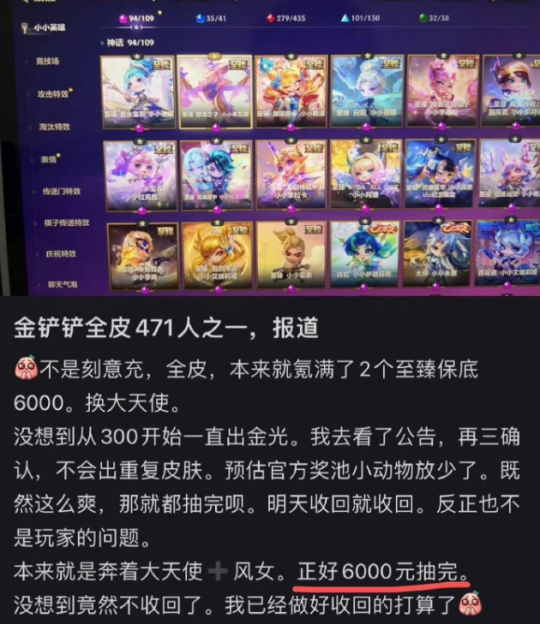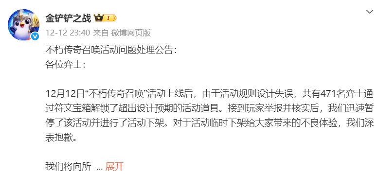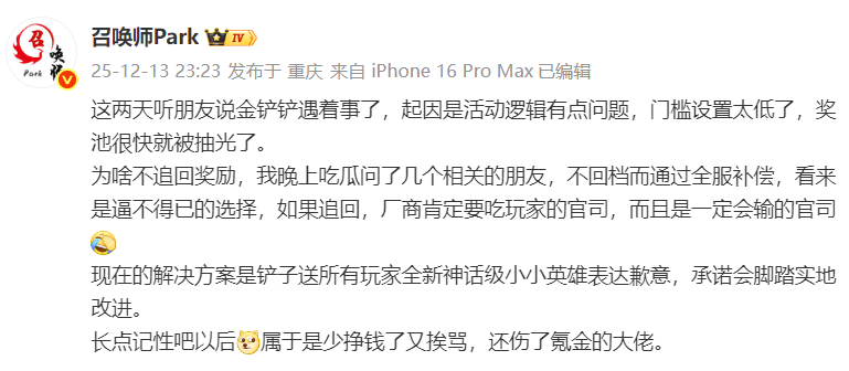 近日,有关《金铲铲之战》“不朽传奇召唤”出现氪金BUG的事情,引来了诸多玩家的热议。而经过两天的紧急处理,官方也是连发两次补偿,一是给所有参与活动的玩家发放【英雄级小小英雄宝箱】,二是给全服玩家发放全新神话级小小英雄【月华之子 海月神 小小佛耶戈】。可让人意外的是,这一次,玩家却不想要补偿,而是想要找官方要个公道。 有关这个BUG呢,说起来也十分诡异,就是“不朽传奇召唤”这个卡池存在一个神秘的软保底机制。如果玩家一次性充值大笔金额,且连续抽取小小英雄的话,有几率会触发这个BUG,导致次次出金,只需要6000左右就能搬空卡池,拿到原本需要花10万元才能获得的全皮肤。 因此,官方也是第一时间就关闭了这个卡池抽取,并发布公告表示,仅有471名玩家触发了这个BUG。可有点让人捉摸不透的是,官方并未对这471名玩家做出处罚,只是向所有参与活动的玩家发放【英雄级小小英雄宝箱】进行补偿。 但不少玩家仍对这个处理不是很满意,他们觉得,活动是全服上线,但补偿只给那些参与活动的玩家发,有点抠门。以及那些用BUG拿皮肤的玩家,一点处罚都没不说,还能领取这个小小英雄宝箱有点抽象。 而后,金铲铲官方也根据玩家的呼声,追加了全服补偿,即全新神话级小小英雄【月华之子 海月神 小小佛耶戈】。 即便到这个时候,很多玩家依旧觉得不公平,因为有关那471个卡BUG玩家的处罚还是没公布,官方送得越多,那些玩家占的便宜就越大。 但根据一些舅舅党的透露,之所以金铲铲官方一直没公布对BUG玩家的补偿,主要是因为从活动规则来看,这些同样花了钱的玩家并没有产出“不当得利”,只是他们的爆率比其他人高了亿点点。所以,不论是回档还是处罚,《金铲铲之战》官方都面临着被打官司的可能性。 另外,还有人曝光整个项目组成员的年终奖、绩效激励都因为这件事泡汤了,也不知道真假。 总之,有关究竟要如何处理这个氪金BUG,官方尚未有一个准确的答案。从目前玩家的反对声来看,后续极有可能会再度追加补偿,大家可以期待一下。 |