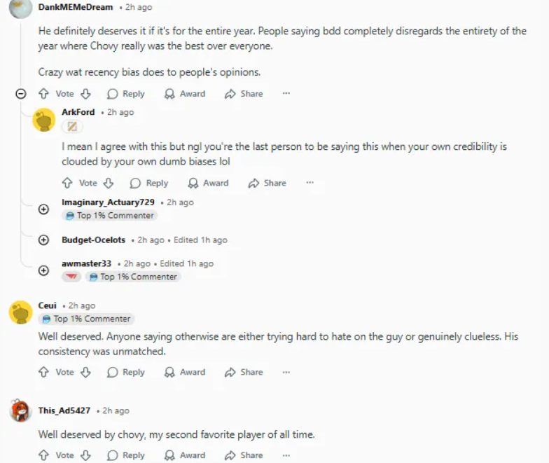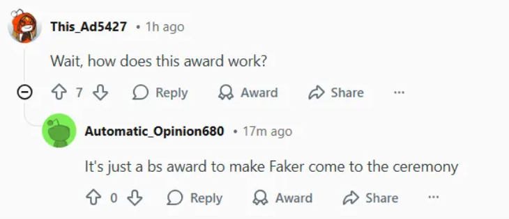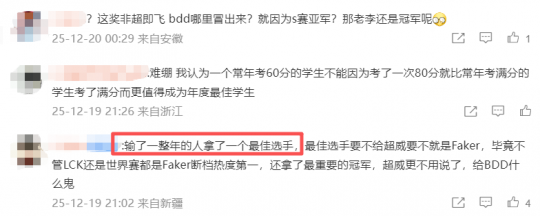 12月19日晚,在LCK 2025年度最佳选手的颁奖典礼上,出现了令人意想不到的一幕。老将BDD居然力压一众选手拿到了年度最佳,而超威则包揽了年度最佳中单、常规赛MVP、LCK一阵,反倒是传奇六冠王Faker只拿到了一个最佳体育精神奖。 具体获奖名单如下: 年度最佳选手:BDD 年度最佳上单:Kiin 年度最佳打野:Oner 年度最佳中单:Chovy 年度最佳下路:Gumayusi 年度最佳辅助:Keria 常规赛MVP:Chovy 年度最佳教练:Kim(GEN.G) 年度最佳新秀:Diable(BFX) ALL LCK 一阵:Kiin、Canyon、Chovy、Ruler、Duro(25GEN全队) 最佳 KDA 选手:Ruler 最多英雄使用选手:ShowMaker 最高单杀次数奖——DK Siwoo、HLE Zeus 最佳体育精神奖:Faker 最佳偷龙奖:Cuzz 最佳时刻奖:BDD的眼泪 该年度评奖的结果公布后,就在各个赛区掀起轩然大波,大家除了困惑Faker差点颗粒无收之外,更对评奖的打分机制提出了质疑,搞不懂为啥BDD拿了年度最佳选手,却无缘年度最佳中单,以及为啥Gumayusi能拿到最佳下路,但多兰却无缘最佳上单选手。 一些暴躁老哥甚至直接开喷组委会,请Faker过来蹭流量,却连一个年度最佳都不愿意给,这太扯淡了。 讲道理,这个LCK最佳的评奖结果确实让人十分迷惑。如果你是说按照LCK一整年的表现来看,超威能拿到年度中单是没问题的,但他为啥无缘年度最佳选手呢? 可要是综合世界赛表现来看,BDD固然励志,但Faker稳定的发挥与广袤的英雄海,难道不是更配得上年度最佳嘛?借用网友的话来说,在人情世故这一块儿,T1还要加强学习。 但话又说回来了,考虑到T1在常规赛的表现也有点一言难尽,如果只是从全年数据来看,GEN显然是更好,所以组委会这个评奖也是有一定的道理。 唯一让人迷惑的还是评奖标准的“灵活变通”,一会儿给超威最佳中单,一会儿给BDD年度选手,却只给Faker一个体育精神奖,确实有点耐人寻味。 |