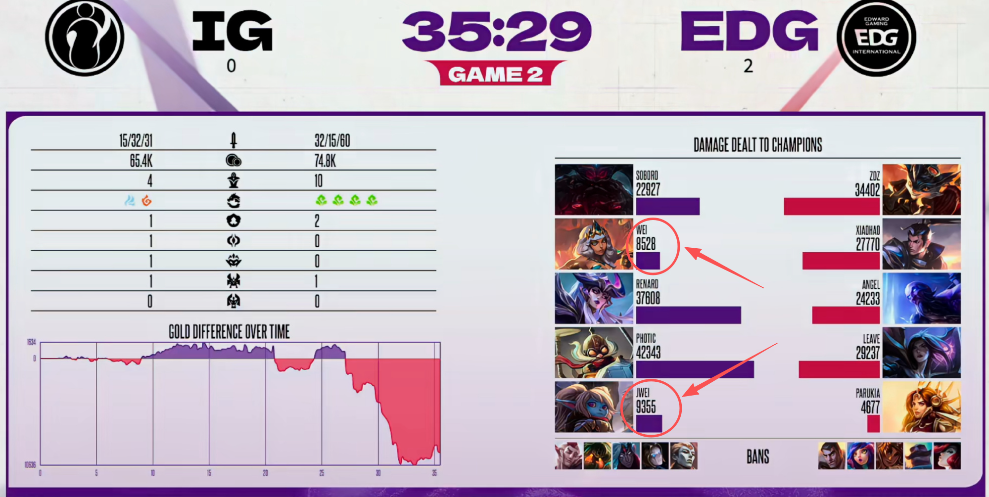 为何IG满怀信心组建的全神班,会折戟于世界赛17强?Shy哥又为何会突然不想打了?Rookie也选择要在德杯休息? 这一切问题的答案,似乎在12月20日晚的IG对EDG比赛上获得了解答。在之前一直以BLG复仇者身份出镜的选手Wei一连贡献了,琪亚娜反向大招跟野核伤害不如辅助两大名场面,看得IG粉丝道心破碎。 先聊琪亚娜反向空大这个事。平心而论,Wei哥这个闪现Q的机会抓得机会很好,正好控制住了EDG脱节的大C瑞兹。此时IG仅落后EDG 3K经济,只要能秒掉瑞兹,就能打出一波逆转。但让人不理解的是,Wei为什么没打出齐亚娜最常用的QER连招,而是直接用了QR,且反向甩R,没有击中任何人。 通过慢放我们是可以看出,瑞兹对于琪亚娜的闪现Q是完全没有防备的,并没有提前给到E打印记。别说是职业选手了,就连黄金白银的玩家也能瞬间Q接E再接R,将瑞兹反向推回来。可Wei也不知道为啥,愣是没接上E技能,反手就把R给甩了。 也正是这个离谱的操作,把一众网友给看乐了:“琪亚娜R完了瑞兹才刚刚挂上E,没禁锢也能反向大,纯菜”。 更为离谱的是,根据赛后的伤害统计来看,Wei作为野核的琪亚娜输出是8528,别说是远低于对位的EDG打野赵信了,就连自家辅助波比打出的9355伤害都不如,仅比对面辅助曙光女神高一些。 无独有偶的是,第一局由Wei操刀的猴子打出的伤害也十分辣眼睛,都能被对位的石头人给完爆的。让人看不明白,Wei这两局到底在干什么,拿着节奏型打野却在野区闷头狂刷。 对此,很多网友都对Wei现在的状态表示担忧:“我只能说明年是ig的粉丝有福了”,“很难想象去年ig带着这么个打野拿到的四号种子”,“大家给点时间吧”…… 但话又说回来,很多队伍与选手都是以赛代练的心态来打德杯,大家也不用太过悲观。只是Wei作为一名老将,本该在这种局里掌握雷电,但出人意料的是他不仅输了,还被对面完爆,也难怪IG粉丝会急眼。 |