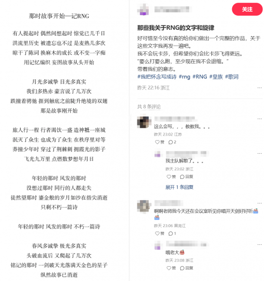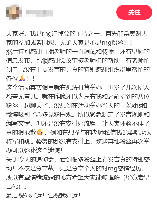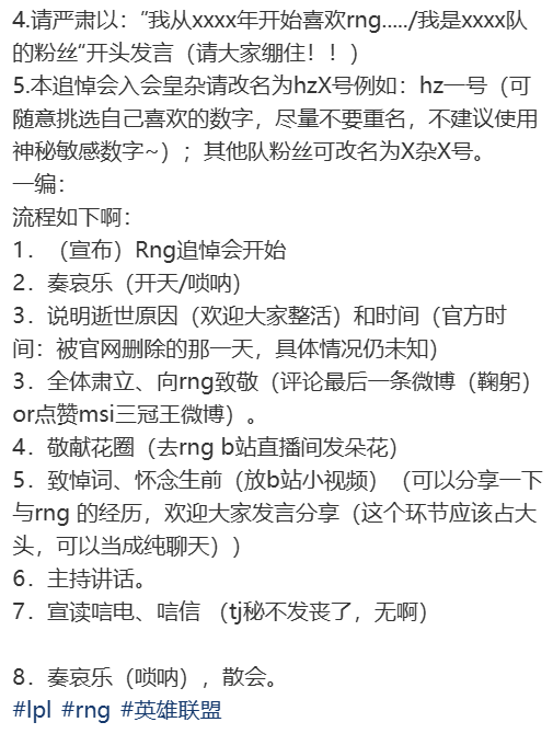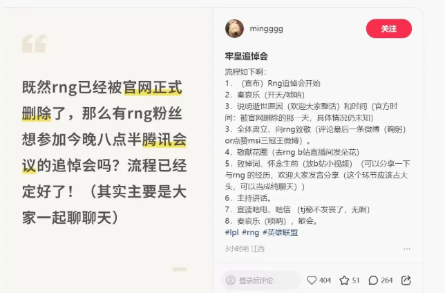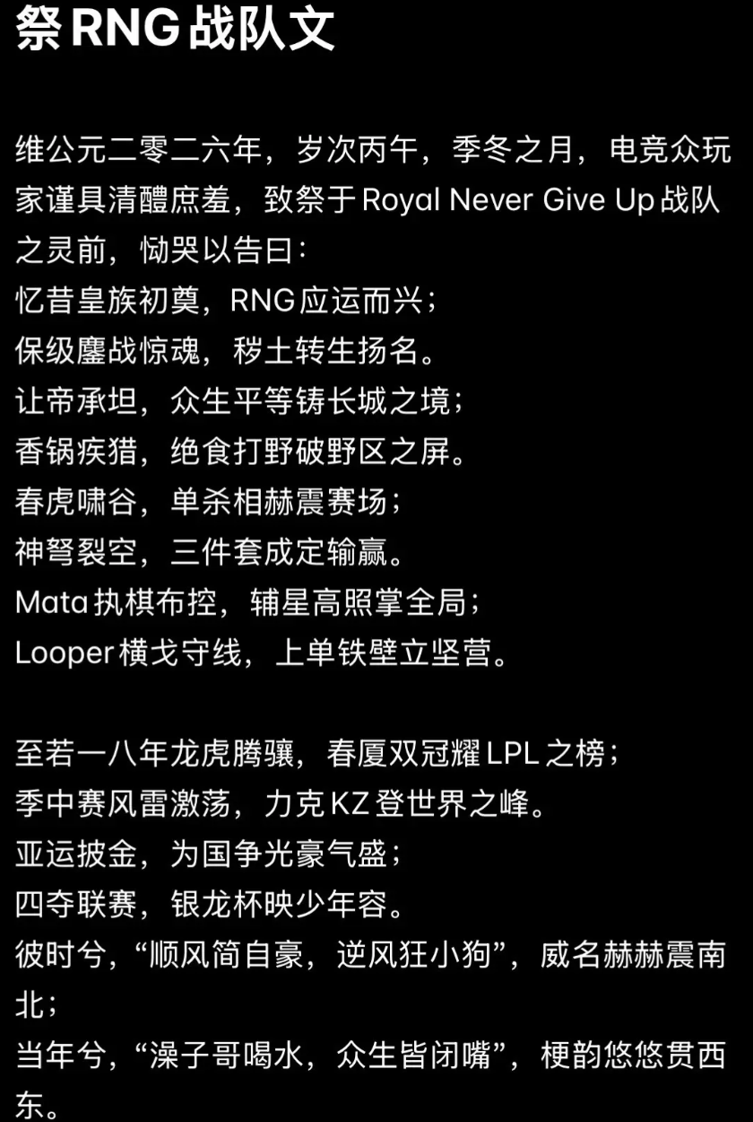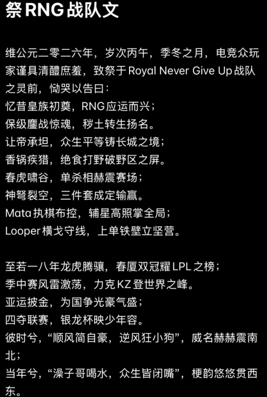 1月9日,RNG海外官推已正式退出LPL,引发了全网关注。虽然目前国内尚未有消息确认,但很多玩家还是自发地发起了“悼念RNG”的活动,其中包括但不限于写祭文、写诗,以及开赛博追悼会。而网友的这些行为,又在网络上掀起了新一轮对于RNG这个俱乐部的是非功过讨论。 据悉,有关RNG追悼会的举办,是由某红书用户“mingggg”发起,原计划在1月9日晚上八点半在腾讯会议拉个聊天群,大家共同缅怀一波曾经的LPL豪门。 随着大量网友的出谋划策,这场“赛博追悼会”不仅有了实况转播,甚至还有了参会要求,即,需要到场发言的粉丝出示“RNG超话等级或大致想要发言的内容”;发言内容以“我从xxxx年开始喜欢rng...../我是xxxx队的粉丝”作为开头格式。 与此同时,整个赛博哀悼会还编排出了一套完整的流程: 1.(宣布)Rng追悼会开始 2.奏哀乐(开天/唢呐) 3.说明逝世原因(欢迎大家整活)和时间(官方时间:被官网删除的那一天,具体情况仍未知) 3.全体肃立、向rng致敬(评论最后一条微博(鞠躬)or点赞msi三冠王微博)。 4.敬献花圈(去rng b站直播间发朵花) 5.致悼词、怀念生前(放b站小视频)(可以分享一下与rng 的经历,欢迎大家发言分享(这个环节应该占大头,可以当成纯聊天)) 6.主持讲话。 7.宣读唁电、唁信 (tj秘不发丧了,无啊) 8.奏哀乐(唢呐),散会。 受到“赛博追悼会”的感召,很多RNG粉丝也借此创作了一系列诗文、祭文。 例如:有人提起时,偶然间想起时,惊觉已几千日,洪流里历史,被遗忘也不过是,麦熟几多次。晾干了陈词,换麻木的成长,或不变一字痴,用记忆编织,妄图故事从头开始。 RNG,别为我哭泣;RNG,我为你哭泣…… 忆昔皇族初奠,RNG应运而兴;保级鏖战惊魂,秽土转生扬名。 让帝承坦,众生平等铸长城之境; 香锅疾猎,绝食打野破野区之屏。 春虎啸谷,单杀相赫震赛场; 神弩裂空,三件套成定输赢。 当然,这次赛博追悼会也引来了一群吃瓜看乐子的网友,除了大家最关心的Uzi工资啥时候结清这些问题外,网友还提议:“一起看1020的录像作为结束吧”,“我有个疑问,当年rng核心粉丝是不是被圈了最后一波股东黑卡钱?现在有人维权吗”,“什么时候五把加里奥的录音出来了再叫我”…… 但不论如何,这场赛博追悼会还是磕磕绊绊地在1月9日晚上成功举办了,一度吸引来上千位RNG粉丝激情回忆,牌面十足。事后,举办者mingggg也发文感谢了广大网友的支持:“关于今天的追悼会,看到很多粉丝上麦发言真的特别感动!不仅是分享故事更是分享个人的对rng感情经历,所以有些情绪流露的地方希望大家能够理解(毕竟老皇已死)。” 就事论事,虽然RNG俱乐部在“欠薪”与“卡合同”上面存在着非议,但确实算是陪伴LPL一路走来的老俱乐部了。这次RNG的解散,也意味着一代人的青春结束。 |
