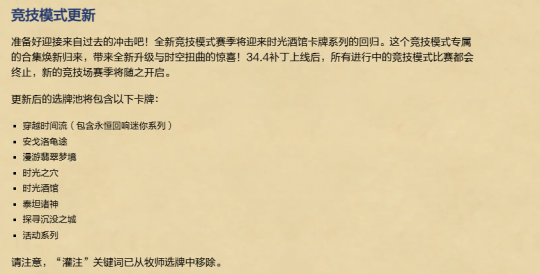 炉石传说新版本“穿越时间流”将于明日正式上线,本次更新除了新增38张独特卡牌以外,竞技场也迎来全新赛季,不仅时光酒馆系列卡牌回归,还能白嫖门票。而对于这次的大版本更新,暴雪也是提早一天发布补丁说明,同时向玩家公布了新宠物与两大活动。 首先,这次的迷你系列卡包共有4张传说,1张史诗,17张稀有以及16张普通,价格为98符文石或者2000金币,全金色版本则需要388符文石或10000金币。值得一提的是,由于该系列引入双职业新卡,届时每个职业的构筑都会有所变化,可以预见的是,新版本的环境将会重新洗牌。 同时,竞技模式的全新赛季也会一同开启,不仅对选牌池进行轮换,还将“灌注”从牧师选牌里移除,具体的卡池如下: 1、穿越时间流(包含永恒回响迷你系列) 2、安戈洛龟途 3、漫游翡翠梦境 4、时光之穴 5、时光酒馆 6、泰坦诸神 7、探寻沉没之城 8、活动系列 值得一提的是,大家记得在竞技场开一局留着,等补丁上线后系统会强制结算奖励并送你一张门票。 接下来是暗月宝藏换新品了,包括新宠物伊瑟拉以及9款奇幻外观,玩家首次抽取是免费,后续则需要消耗一定符文石。因为这次的新宠物有时间限制(1月21日-2月10日),喜欢的小伙伴请勿错过。 最后说说两个新活动,第一个“永恒回响”在规定的时间内(1月14日-2月4日),完成任务协力作战即可获得4包“穿越时间流”卡牌包、2张“穿越时间流”的随机史诗卡牌、1包“穿越时间流”金色包、时光之末卡背图案和永恒幸运币。 第二个“时间流危机”活动紧接着2月4日-2月11日,玩家完成任务将获得2包“穿越时间流”卡牌包、1款随机未拥有的狮鹫年多头蛇年或独狼年的卡背图案以及1款随机未拥有的狮鹫年、多头蛇年或独狼年的轻量英雄皮肤。 话说回来,国际服这个活动是送嘲风望月露娜拉英雄皮肤,而国服这次换成了轻量英雄皮肤,把原来的奖励放进2026年新春活动中,只要参与即可免费获得。总的来讲,这次新版本的奖励算是诚意满满,不知道明天的环境会发生怎样的变化呢? |