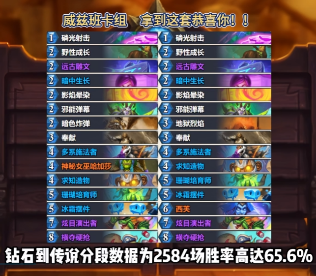 近日,随着炉石新补丁上线,标准环境中萌生了各种奇奇怪怪的卡组,造成此现状的主要原因是一张旧卡突然崛起,它就是“酷炫的威兹班”。在经过设计师升级之后,该卡已经成为新版本的T1级别。此外,还有一张更猛的新卡“战争大师黑角”,效果是摧毁双方玩家手牌库所有法力值小于或等于2的卡牌,直接把猎人和盗贼给摁死,有点不讲道理。 由于这两张神卡的诞生,国服环境又将迎来新一轮的洗牌,而下面的三套卡组在目前高分段里都有不错的表现,不妨参考一下。 黑角防战 防战在“战争大师黑角”的加入下,其强度至少提高三档,除了猎人和盗贼以外,瞎子的传送门也容易被黑角克,非常霸道。最关键的是黑角是一张7费卡,纵观所有职业,仅有防战最为适合,妥妥的专属卡。 代码如下: AAECAce+BQ7HpAbVugaOvwb6yQaq6gaDigfujwe2lAfUlwfblweCmAeEnQfKqweLvgcIiKAEiaAEjtQEh6AG88oGsOIG6qcH/K8HAAED9bMGx6QG97MGx6QG694Gx6QGAAA= 快攻术 由于“挟持射线”的增强,从2费变为1费后,快攻术前期节奏比原来更快,射线+邪火的Combo能让你的小恶魔铺满整场,再配上加强后的阿克蒙德直接起飞,但凡对手击杀能力弱一点,极有可能被直接推平。 代码如下: AAECAd+qBgLHpAbF5QYOhKAE054G1J4GmrMGlcoGneQGweQG1/MGw4cH15cHhJkH8ZsHpK0HirEHAAED87MGx6QG9rMGx6QG694Gx6QGAAA= 节奏瞎 虽说传送门容易被黑角撕掉,但其实节奏瞎并不依赖它,最主要还得看伊莉斯咆哮和亡语标,用得好就不虚战士,起手的牌序非常重要。但话说回来,黑角算是近两年来先行橙里搅动局势最强的牌了,这卡拍下来发现猎和灌注贼半套牌直接消失,连瞎子的布洛克斯加也没了,着实有点吓人。 代码: AAECAYfPBgycoATh+AXHpAb6wAb8wAaq6gbB/gaDigeCmAeKqgeSqgeTqgcJw7AGqrgG9sAG3v8GtpcHh5wH0a8H4rEH6LEHAAED9bMGx6QG97MGx6QG694Gx6QGAAA= 最后说一下威兹班卡组,目前胜率最高的是这套多系DK,胜率高达65%。无论是前、中、后期几乎都没有短板,唯一缺点就是怕拿不到。 |