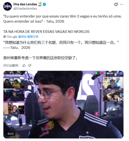 近日,FURIA打野Pedro'Tatu'Seixas的一番话在《英雄联盟》圈内炸开了锅。在率领战队以碾压姿态赢下美洲杯后,这位巴西选手直接开火,质问拳头游戏:为什么LCS比CBLOL(巴西)多两个S14世界赛名额? 这项跨赛区赛事汇集了CBLOL杯赛亚军、季军与LCS季前赛亚军、季军,争夺前往MSI 2026的资助集训名额。FURIA全程一场未输,以8-0的完美战绩夺冠 赛后,Tatu在巴西流直播中直接开麦:“我就想弄明白,凭什么他们有3个名额,我只有一个?我就想知道这是为什么。” 今年美洲区整体比去年多了一个名额,LTA赛区去年有3个世界赛名额。现在两个美洲赛区加起来有4个名额,但多出来的那个给了LCS——LCS夏季赛第三名将直接拿到世界赛门票。而CBLOL这边,只有季后赛冠军能去世界赛。 这种分配方式,根源在于历史定位:LCS一直是“顶级赛区”,而CBLOL被划为“新兴赛区”。历史地位能否决定名额分配,本身就值得商榷。更何况美洲杯的结果,恰恰证明了巴西赛区这些年的进步——尽管国际赛上他们还是经常被NA压制。 Tatu的言论在社交媒体上引发热议。有网友建议,让LCS第三名和CBLOL第二名打个附加赛,确保名额分配能真实反映赛区实力。 你觉得《英雄联盟》S赛的名额分配合理吗?欢迎来评论区讨论。 |