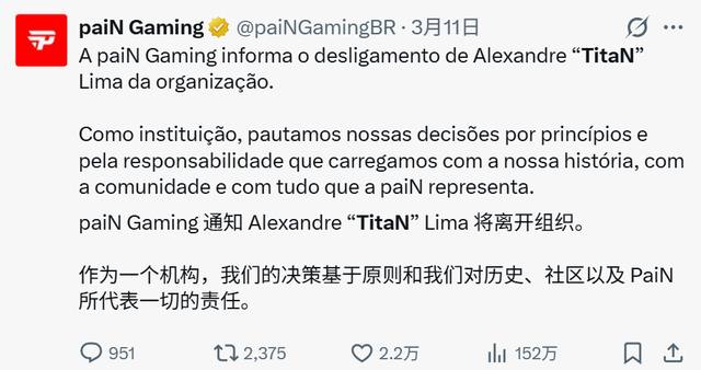在英雄联盟电竞这一领域当中,巴西无疑是对LOL抱有很高热情也非常有活力的一个地区,这两年巴西CBLOL赛区的收视甚至已经能够稳压北美LCS一头。 虽然巴西在国际赛事一直是以外卡赛区的身份存在,实力完全和四大主要赛区的强队相提并论,但是偶尔在世界赛的舞台能够看到巴西赛区的队伍给观众带来惊喜。 比如最早大家熟悉的一位巴西LOL选手,就是当年在S6世界赛舞台上爆冷击败EDG的INTZ战队的打野选手Revolta。 在赛前他自称是厂长的忠实粉丝,赛后他的盲僧也因出色发挥被送上了“巴西圣僧”的称号。 而最近几年比较出名的巴西LOL选手,恐怕就是2022年MSI舞台上的巴西狙神TitaN了。 在那届MSI对阵PSG的比赛中,作为RED战队首发AD的他选择了烬这个英雄,自信闪现盲W的操作技惊四座,也让观众对他有着很深的印象。 作为巴西CBLOL的传奇选手,TitaN曾经多次代表巴西赛区出战S赛以及MSI等国际赛事。然而这位巴西电竞界的知名选手,却在最近深陷丑闻风波当中,被多名女性指控性犯罪。 根据外媒SheepEsports发推报道,多名女性对TitaN提起诉讼,指控对方涉嫌性骚扰以及传播和前女友的色清内容,甚至还涉嫌强奸弱势群体。 目前TitaN因传播色情内容、强奸弱势群体、性骚扰这三项罪名,已经被巴西圣保罗州公共安全厅(SSP-SP)立案调查。 随着TitaN的丑闻风波愈演愈烈,顾忌到舆论影响的巴西战队PNG也早在该选手被起诉后就与其解约,并将其移出了队伍的主力阵容名单。 这一波光速切割让事件的真实性有所上升,而TitaN这位巴西LOL的知名选手如此炸裂的丑闻,确实是让电竞圈的吃瓜网友目瞪口呆。 毕竟以往电竞圈的选手哪怕是被曝出黑料,大多也是私生活或者道德方面有些瑕疵,但是如果TitaN的罪名坐实的话,那么不仅职业生涯会直接结束,甚至可能会进去踩缝纫机。 当然,目前整个事件还只是处于立案调查阶段,事情的真相如何还无从得知,不排除TitaN是清白的这种可能,但具体结果如何还是等到官方通报才能有定论了。 |