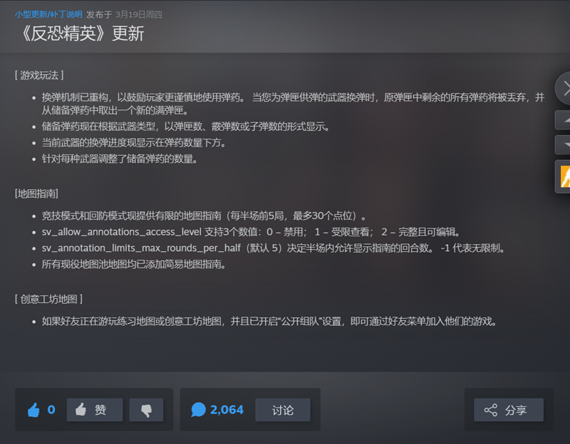 3月19日早晨,Valve推出了CS2更新,该更新重做了武器换弹机制,使用弹匣供弹的武器进行换弹时,当前弹匣中所有剩余弹药将被丢弃,并从备用弹药中更换全新满弹匣。 换弹机制重做,旧弹夹剩余弹药将被丢弃 有不少用户对此次CS2更新表示不满,据而媒offstage报道,根据Steam数据,仅有34%的用户对此次更新给出正面评价,超过5000名玩家对换弹机制的改动持负面态度。此次游戏更新这也成为了CS2游戏史上评价最差的更新。 目前开发者已关闭了该公告的评分功能,并隐藏了总评分数据。 |