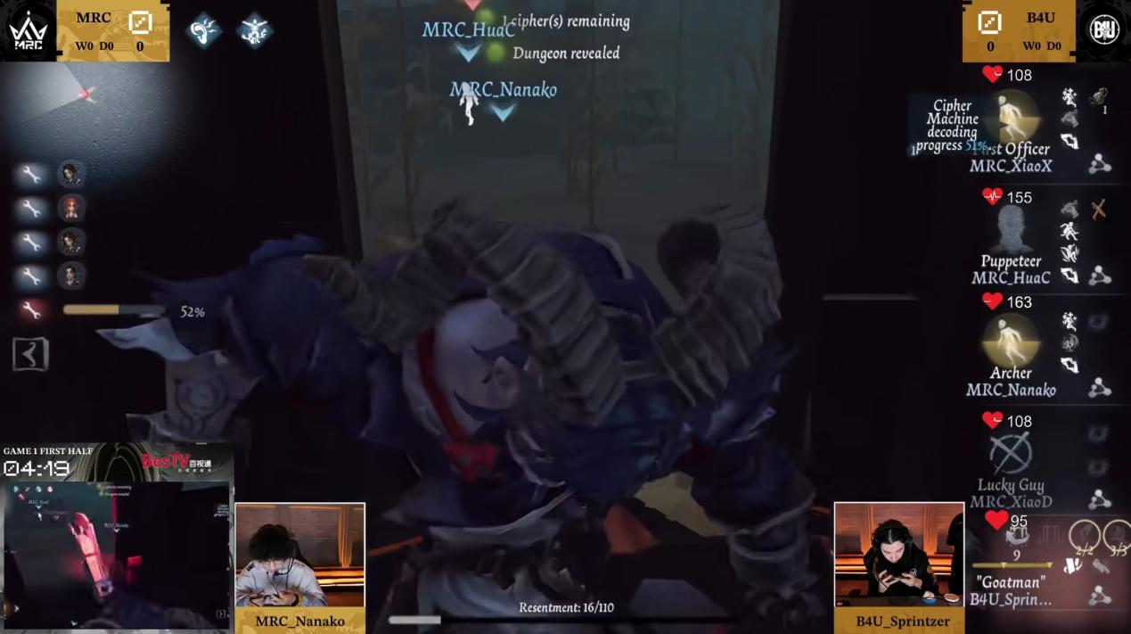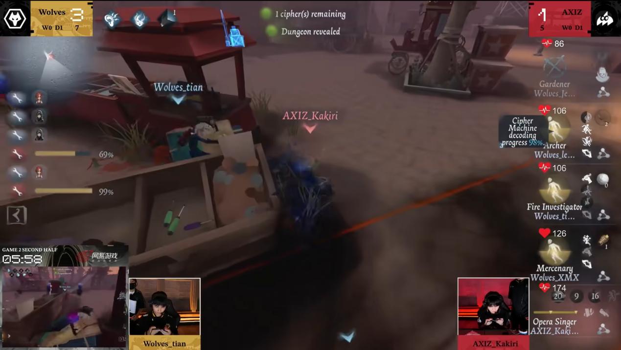 【赛果总结】 深渊的呼唤,简称COA(CalloftheAbyss),是《第五人格》最高级别、最高含金量、最高竞技水平、最高知名度的全球赛事。本次COAⅨ全球总决赛-小组赛阶段落地上海长三角国际电竞文化中心,历经十天的鏖战,来自全球六大赛区的二十支精英战队们给我们留下了难忘的回忆,晋级淘汰赛的12个名额最终确定,各战队偃旗息鼓,将在接下来的两周休养生息,准备向第五人格最高对决舞台——深渊的呼唤全球总决赛淘汰赛发起终局挑战。在回顾本周比赛的高光时刻前,先让我们恭喜晋级的全球十二强战队,他们分别是:北京WBG、Gr、FL、MRC、RC、AXIZ、FPX.ZQ、ZETA、TE、成都Wolves、ACT、B4U! 【高光时刻】 开幕战DFMvs北京WBG第一局上半场,DFM_mzk“台球手”开局非常果断,在弓箭手没能成功击中核心之前闪现击倒机械师,WBG_koting飞行家欲图利用悬停骗出主球,但降落的一瞬间主球在椅前生成,将飞行家桎梏于内,使机械师淘汰进度过半。机械师被淘汰后,WBG_Huiyi大副抗住压力,灵活走位不进入板区使监管者迟迟拿不到机会,DFM_mzk从半状态飞行家入手,闪现将其击倒在密码机附近,而后进入巡游状态监控场上情况,WBG_Huiyi提前拉开距离并藏匿行踪,在此期间,WBG_Guoker弓箭手救下飞行家而后补好状态,DFM_mzk主球卡住交互,将弓箭手击倒,半状态大副间续修机给密码机进度施加压力,飞行家无伤将人救下,DFM_mzk进一步将弓箭手挂至遗产机附近,逼迫求生者方换机破译,DFM_mzk再次在临近淘汰进度在椅前释放主球,WBG_koting极限将人救下,WBG_Guoker弓箭手飞轮预判将闪现身位让给飞行家帮自己抗刀,但最终还是不敌DFM_mzk强势进攻,在密码机压好前成功减员,收获四抓。 DFM_mzk“台球手”在弓箭手没能成功击中核心之前果断闪现击倒机械师 12日成都WolvesvsAXIZ第二局下半场,AXIZ_Kakiri歌剧演员开局压迫Wolves_tian火灾调查员走位并消耗其道具,Wolves_Jelly园丁在此期间翻找箱子获得忘忧之香成功应对监管者换追,而后利用过山车以及回想进行牵制,预判闪现但不敌歌剧演员影之回溯。Wolves_tian欲使用气囊保护自身安全,但AXIZ_Kakiri反其道而行之,利用自身以及气囊模型堵路,压缩救人时间,成功将火灾调查员恐惧震慑。成功淘汰园丁后,面对满状态敢于在外修机的弓箭手,AXIZ_Kakiri佯装追击Wolves_lemon弓箭手,实则引诱已经成为白板的火灾调查员出洞,Wolves_tian扛起重任,弥补之前失误,化身刀尖舞者,在终点站双板区极限五次翻版,极大程度延长了自己的存活时间。击倒火灾调查员后,AXIZ_Kakiri采取控场战术,直接传送至二站下密码机,Wolves_XMX为保状态弹护腕上二站乘车而去,AXIZ_Kakiri影跃至终点准备起上挂节奏,Wolves_lemon前来支援,利用龙骨弓射中核心,成功将火灾调查员绝处逢生拖出,同时给佣兵充足时间返回二站继续修机。AXIZ_Kakiri撕开的裂口逐渐被成都Wolves求生者的粘性修复,只能再次从火灾调查员入手,Wolves_tian再次冷静博弈:让身位转圜进板,利用木板遮蔽与兵刃相持,趁出刀后摇果断下板,顶板假翻骗出回溯,短距离身位试探极限反应,空刀后再次灵巧翻板,最终逼迫歌剧踩板得以有机会拉点,整个过程游刃有余,精彩绝伦。Wolves_lemon在开门战阶段,见火灾调查员被击倒,提前拉离大门预防传送,精准命中高速移动中的歌剧演员核心,断其影跃,为佣兵治疗火灾调查员以及开启大门拖到足够的时间,最终拿下一场惊心动魄的平局! Wolves_tian极限博弈,成功将密码机拖至压好 14日ACTvsFL第二局下半场,FL求生者接力保人,逼迫监管者底牌切闪现终结飞行家;开门战阶段,FL_Kat咒术师三层咒像解除“逃脱大师”第一次藤蔓僵直,FL_moririn木偶师及时成为“路易”成功抗刀,最终三人三跑,展现团队合作魅力! FL求生者接力保人,成功三人三跑 16日B4UvsMRC第一局上半场,B4U_Sprintzer“跛脚羊”开局利用合笼特质快速接近MRC_XiaoD幸运儿,使其身位过近反应不及,吃刀倒地开枪。MRC_XiaoX大副摇动海神怀表突破拦截稳定救援,但幸运儿无道具傍身,也无更多牵制余地。弓箭手搭弓干扰和木偶师趁机救援,相互配合将人救下。Sprintzer使用迷失之笼圈困弓箭手阻拦其干扰,成功将幸运儿淘汰。B4U_Sprintzer从MRC_Nanako弓箭手寻找二次节奏机会,MRC_Nanako的应对无懈可击,箭无虚发,利用灵活走位顺时而动与其周旋,在武器刚挥出的一瞬间,撕裂值刚好叠满,攻击戛然而止,MRC_Nanako趁机转点小木屋,看破监管者放笼动机,将身一扭反将“跛脚羊”化为笼中困兽,拆笼后进行砸板,为队伍争取到更多喘息的机会。监管者见节奏逐渐被拖慢,选择传送管控密码机,进行常规守椅,此时局势趋于平局,但密码机点亮一瞬间,B4U_Sprintzer观察到大副向易进难出的大船内拉点,不能及时和木偶师拉开距离,于是直接掉头快速击倒木偶师,而后瓮中捉鳖再次击倒大副,成功收获三抓。整场对局局势一波三折跌宕起伏,属实为一场精彩的比赛! MRC_Nanako看破监管者放笼动机,提前逃出围困进而砸板 19日MRCvsZETA第二局下半场,MRC_BaiLu杂货商开局速杀ZETA_DoLisu医生,木偶师前来一次救援,MRC_BaiLu精准打到针对,二挂后ZETA_Kznk前锋进行撞救,ZETA_DoLisu医生转点至板后进行治疗,并精准砸板命中监管者,ZETA_Kznk利用身体模型卡监管者走位迫使其减速并适时配合拉球干扰,将密码机拖至近四台。待医生被落地刀击倒,ZETA_Kznk再次将其救下,并成功进行抗刀,ZETA_Shinami飞行家接力保护医生,利用喷气背包快速跟上身位并进行